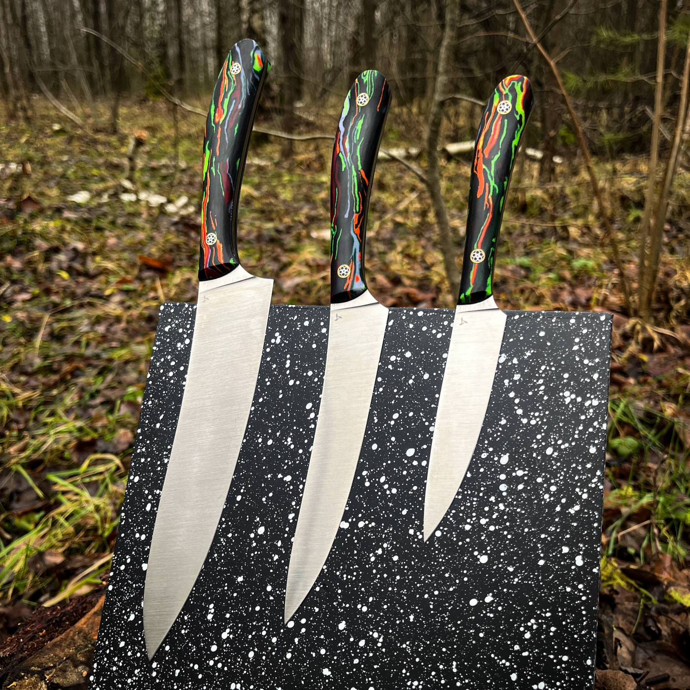 Элегантный кухонный набор из хорошей нержавеющей стали VG10. Долго держат заточку.